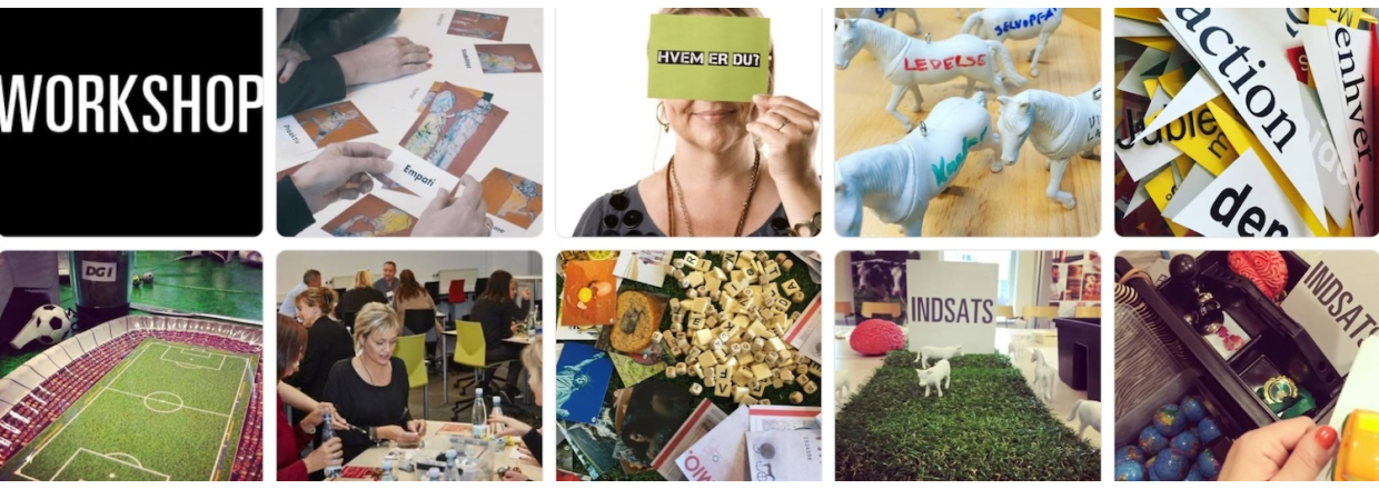 Vibeke præsenterer løbende de forskellige kreative værktøjer og faciliterer workshoppen. I workshoppen deltager det antal i ønsker. Workshoppen foregår i grupper. I an vælge at arbejde i grupperne med en fælles udfordring.